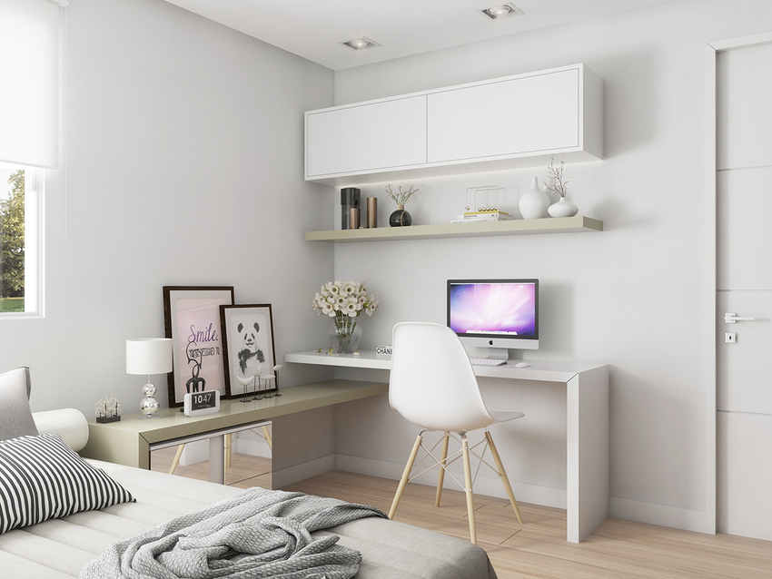 В условиях ограниченного пространства часто приходится выбирать угловой письменный стол у окна, столы-полочки или встраиваемые в стену модели, которые наиболее эффективно используют полезную площадь, обеспечивая не меньший уровень комфорта. Если еще вдобавок мебель будет оформлена в стиле минимализма, то ребенок не утратит концентрации во время выполнения сложных для него заданий.