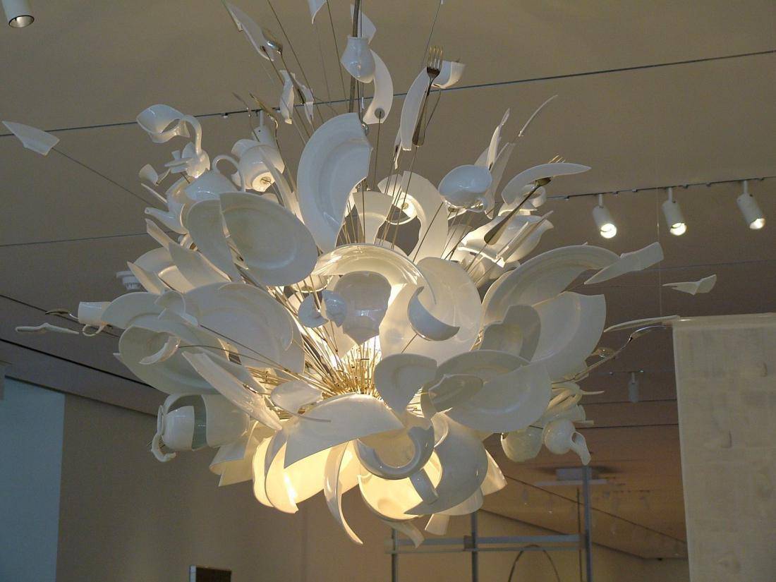 Такую креативную люстру можно применить в качестве настольной лампы, закрепив плафон с патроном на небольшой ножке.