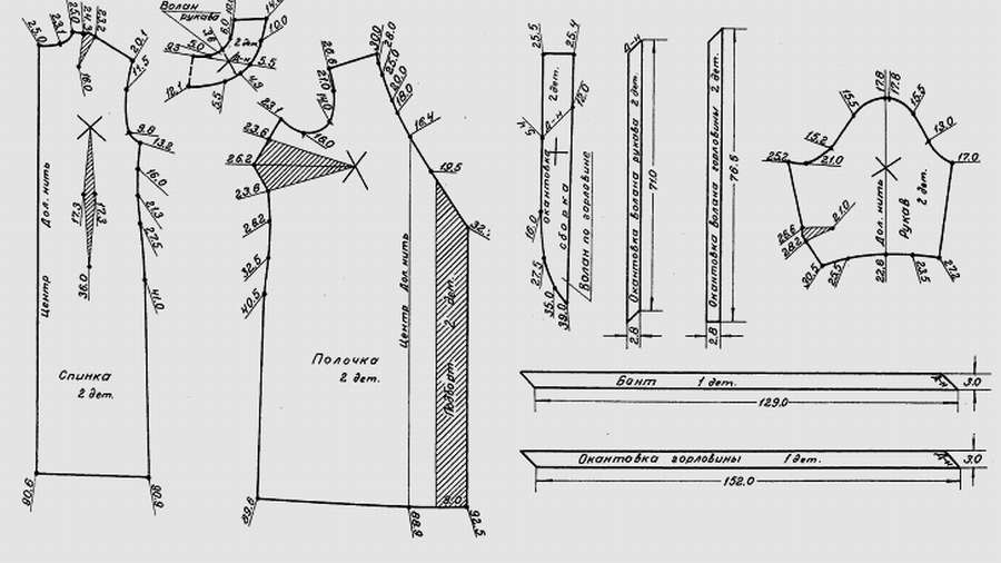 Выкройка женского летнего халата из ситца с отрезным маленьким лифом и низом, подчеркнутым воланами.