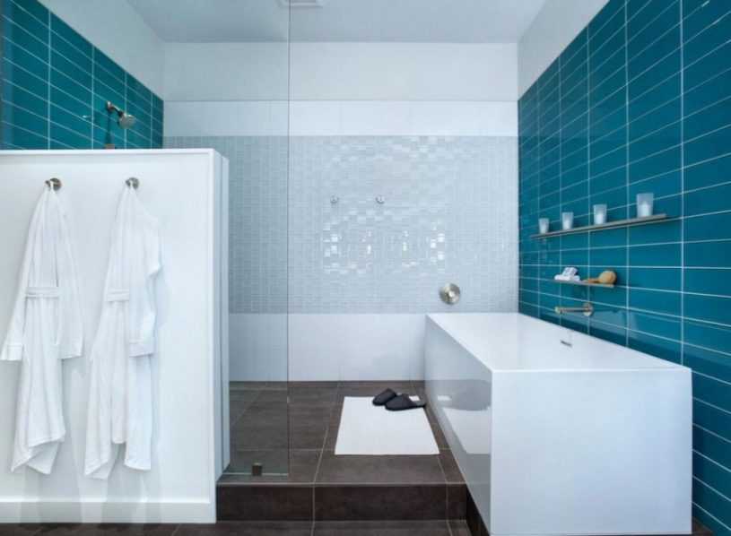 Если деление стен по высоте вас не прельщает, но однотонное оформление навевает уныние, можно рассмотреть вариант с акцентной стеной. Чаще всего ее оформляют плиткой того же цвета, но другого оттенка — на несколько тонов светлее или темнее основного.