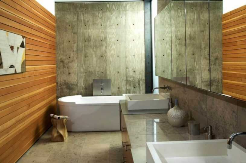 Для создания оригинального интерьера ванной комнаты приветствуется сочетание песочной плитки с природными материалами – деревом или камнем.