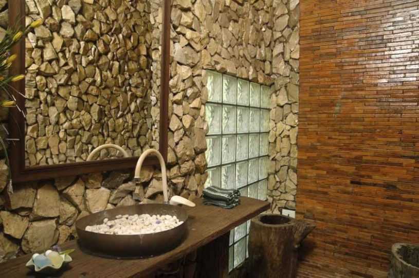 – К плитке «под камень» хорошо подойдет металлическая или стеклянная мебель.