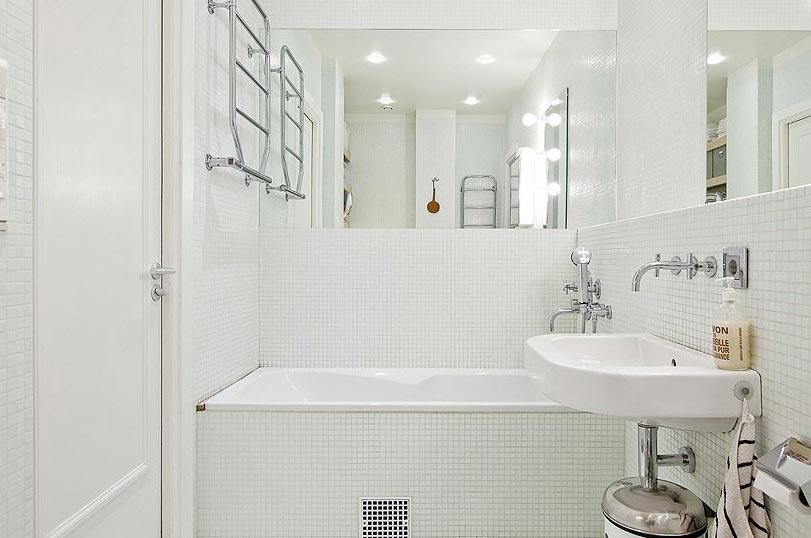 В небольших ванных комнатах как правило мозаикой оформляются отдельные зоны помещения: ниши, выступы, ванна. Остальная часть помещения оформляется кафельной плиткой. Такое сочетание позволит визуально увеличить помещение и сократить затраты на ремонт.