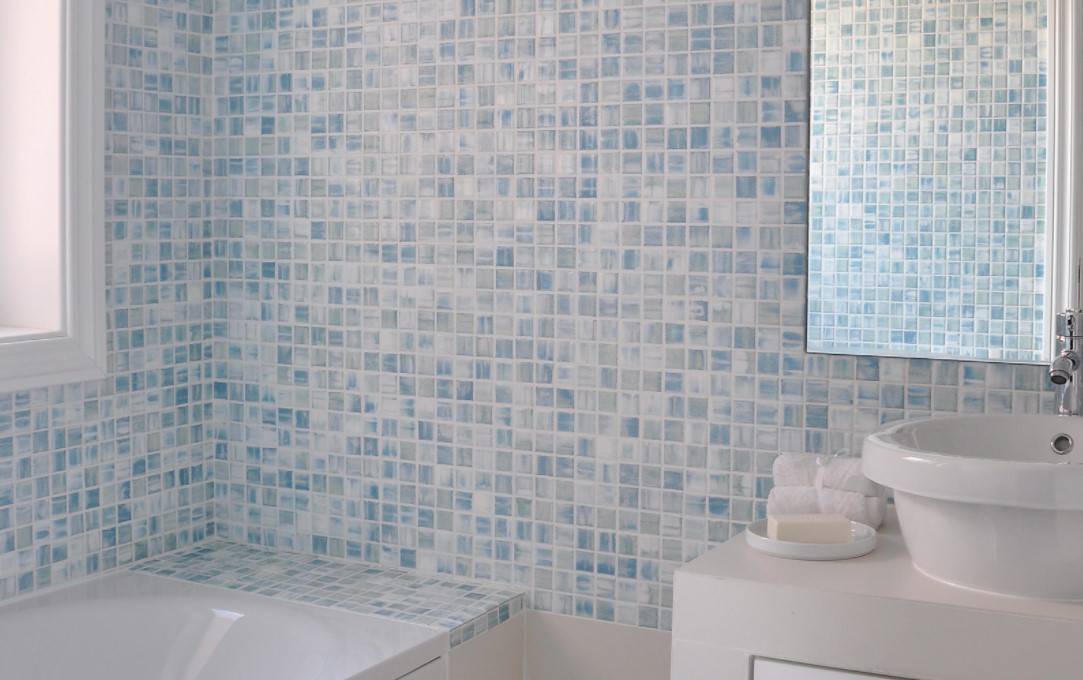 Светло-голубая мозаичная плитка подойдет для оформления небольших ванных комнат