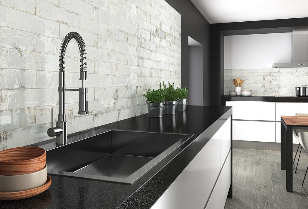 Еще один универсальный цвет фартука, который подходит как для светлых, так и для темных фасадов кухонного гарнитура.