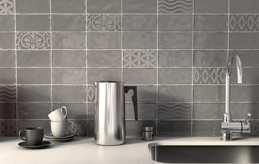 - Декоративные элементы часто используют при облицовке фартуков. Это могут быть вставки с плоским или рельефным рисунком. Их размеры должны полностью совпадать с общей плиткой и по высоте, и по ширине и по толщине.
