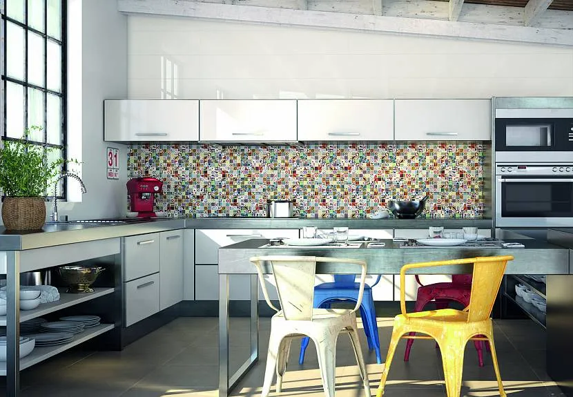 Яркий узор фартука из плитки пэчворкИсточник designmyhome.ru