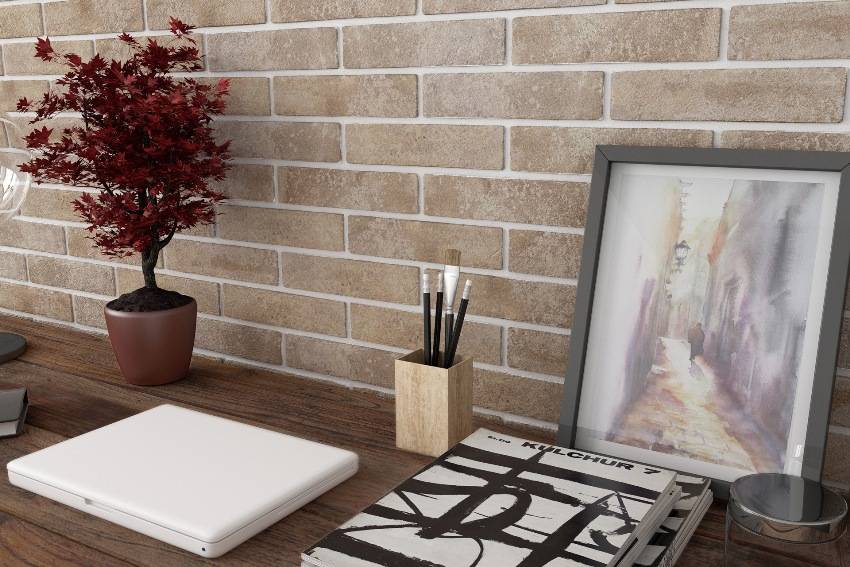 Плитка под кирпич песочного цвета с белой затиркой для швов