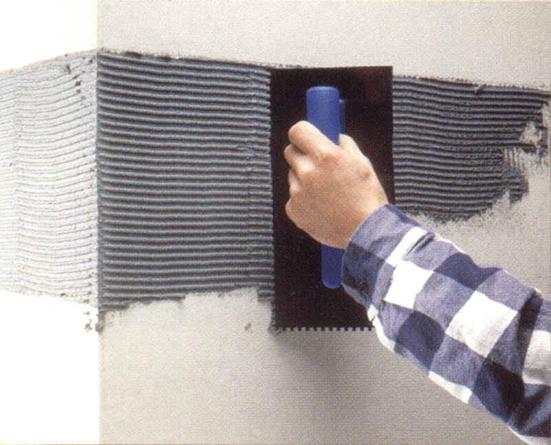 Толщина клеящего слоя до 0,5 см. Если тыльная сторона изделия рельефная, для нанесения клеящего состава пользуются прямым шпателем, для нанесения клея на ровную поверхность следует использовать зубчатый шпатель.