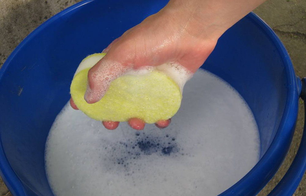 тёплый мыльный раствор. Состав раствора: тёплая вода 10 л, мыльная стружка 2 ст. ложки, сода 5 ст. ложек.