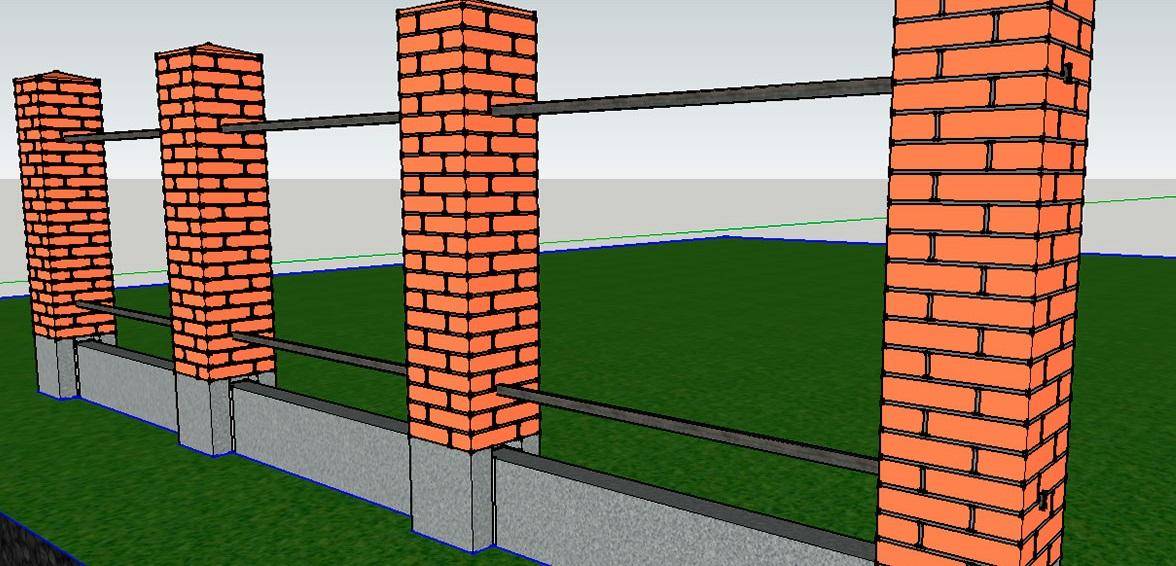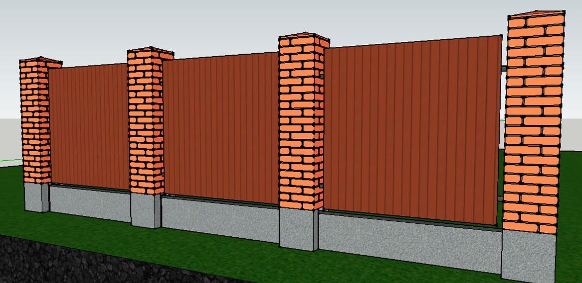 - кирпичные столбы с промежуточными секциями из штакетника;