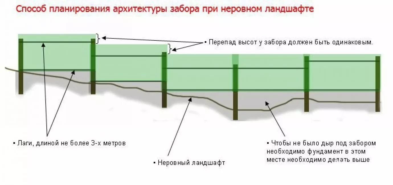 Просвет между рейками не нормирован, и чем он больше, тем дешевле забор. С учетом ранее действовавшего норматива, обычно длину рейки берут около 140 см, чтобы в сумме с просветом возле земли высота забора была 1.5 м. Понятно, что защитные свойства такой ограды невысоки, и она служит лишь для разграничения участков.