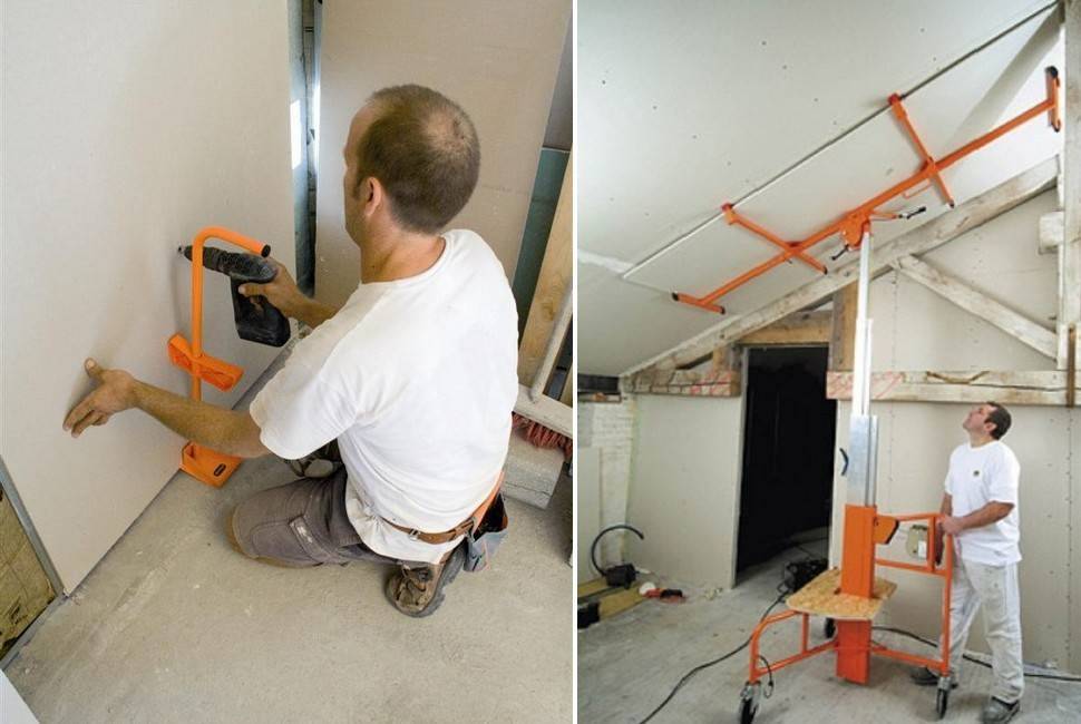 Такие манипуляции произвести одному человеку практически невозможно, поэтому даже профессионалы постоянно берут себе кого-нибудь в напарники. Если же у вас нет помощника и даже достойного кандидата на эту должность, то специалисты рекомендуют приобрести специальный подъемник гипсокартона
