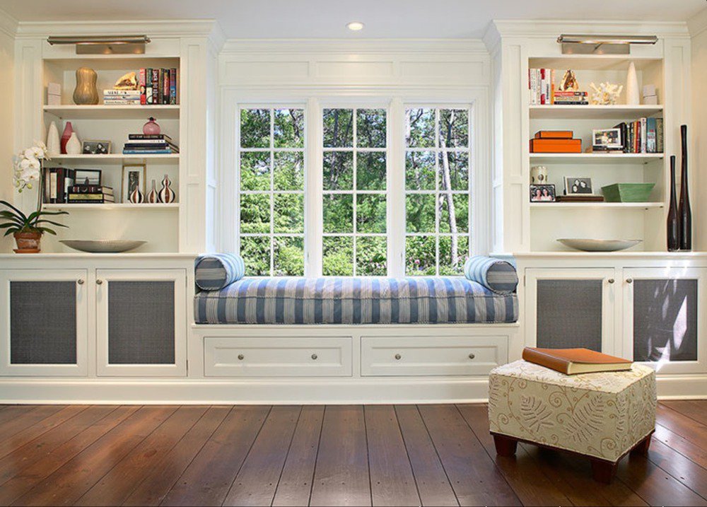 Можно сделать встроенное сиденье во всю ширину комнаты, или поставить по бокам от окна шкафы с одеждой, а между ними организовать сидение с мягкими подушками. Окружающую обстановку подстраивайте под свои привычки.