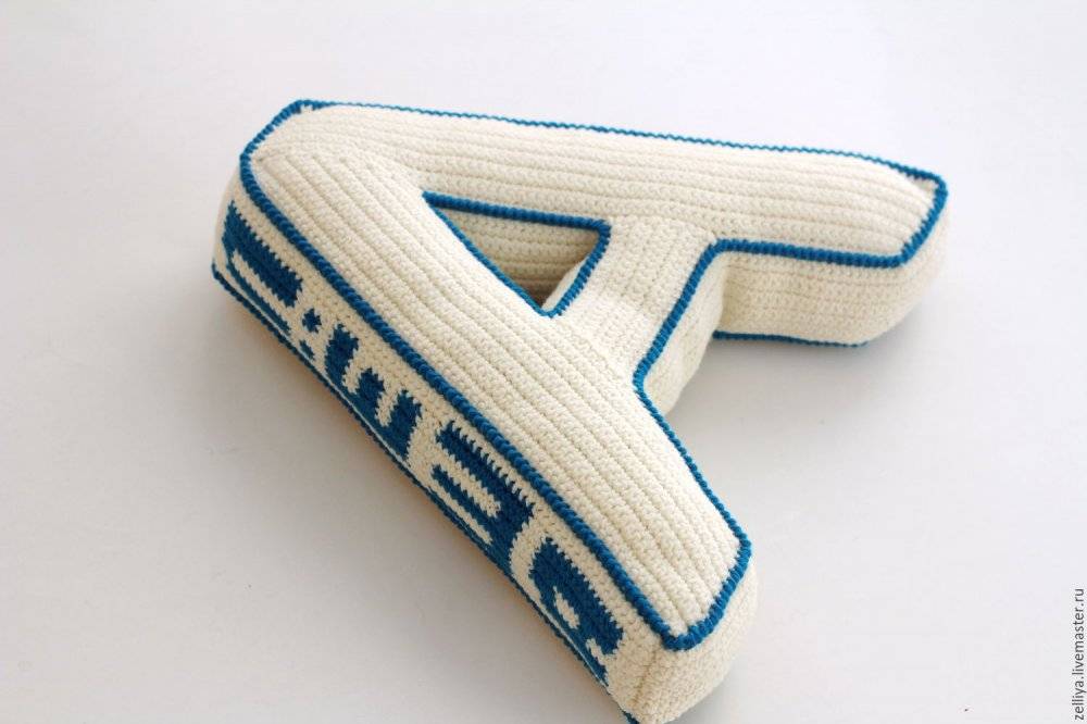 Вязание крючком и спицами тоже не обошло это оригинальный предмет интерьера, и вязаные подушки такого типа выглядят, пожалуй, более уютно и мило, чем сшитые из ткани. Крючком такие буквы вяжут в основном, столбиками с накидом и без накида. Для вязания спицами вариантов схем тоже немало – и платочная вязка, и бабушкины квадраты, и еще несколько подходящих вариантов мастерицы-вязальщицы точно найдут.