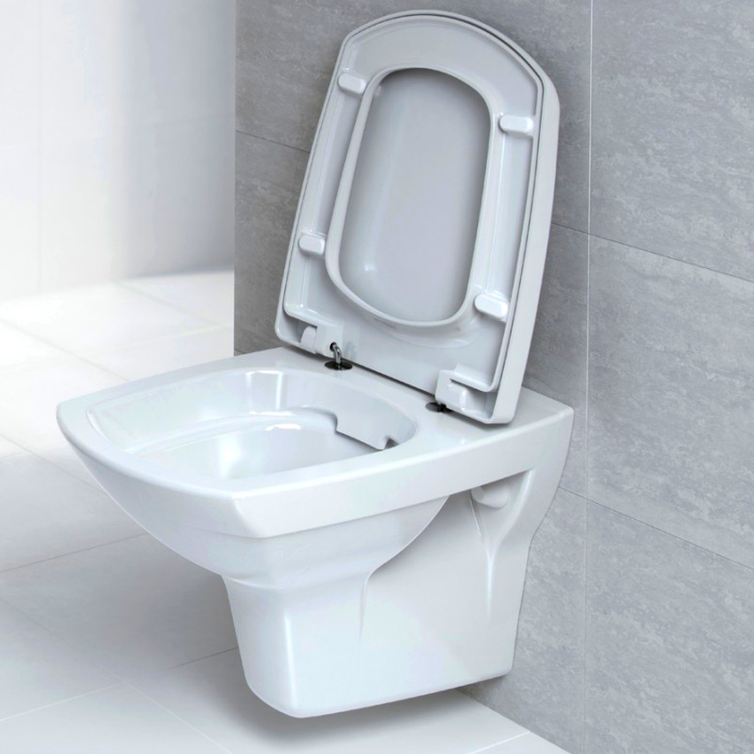 - Carina New Clean On — унитаз, который предлагает польский производитель Cersanit. Подвесная модель из санфаянса с горизонтальным выпуском. Дополнительно прилагается крышка из дюрапласта с покрытием, которое отталкивает грязь. Сиденье можно быстро снять и установить, используя специальную кнопку, что значительно упрощает процесс уборки. Единственный минус, который отмечают покупатели — форма чаши не очень удобна для мужчин.