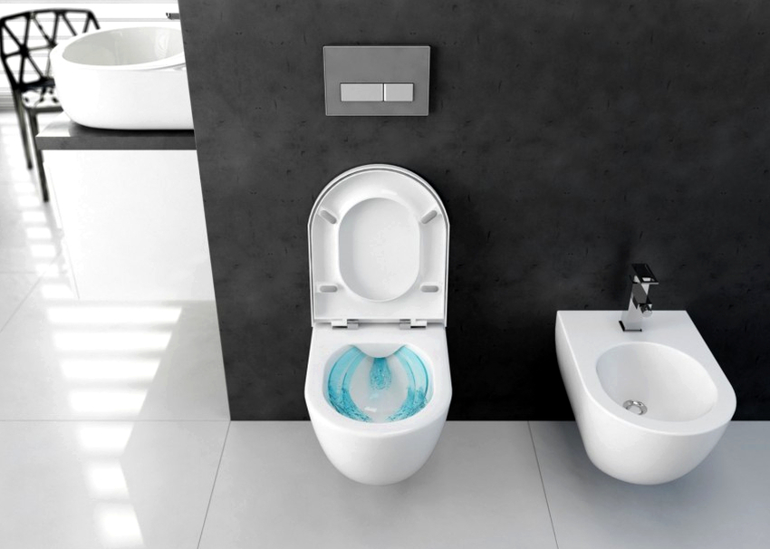 Унитаз безободковый напольный может иметь в комплекте такие новшества, как крышка-биде или специальное сиденье, способное плавно бесшумно опускаться (система микролифта).