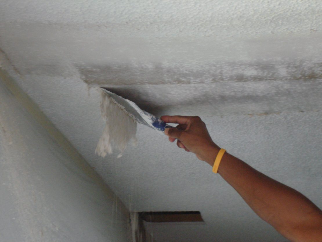 В случаях, когда штукатурка крошится и осыпается, ее нужно удалить. Оставить ее можно, если предыдущий ремонт производился недавно и материал хорошо держится на основе. Проверяют это, постукивая по потолку. Приглушенный звук говорит об отходящей штукатурке, которую требуется сбить полностью.