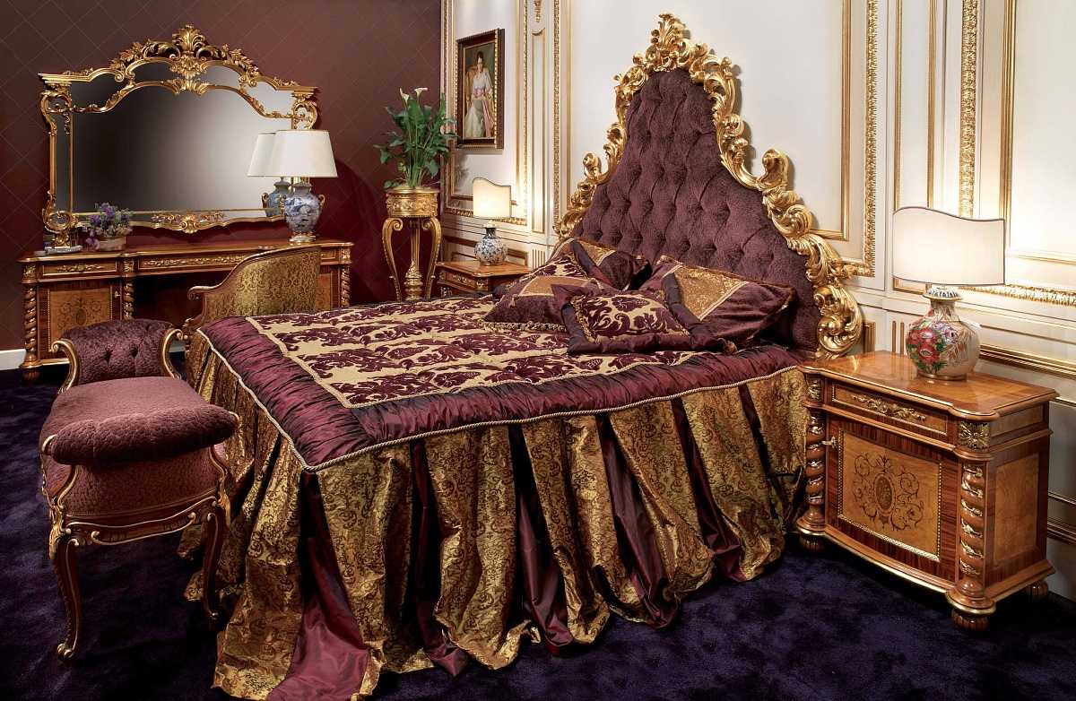 - Кровать в спальне ар-деко или барокко украшается гобеленовым, бархатным или атласным покрывалом. Изделия щедро украшаются кружевами, бахромой, декоративными шнуровками. Цвет полотен может быть насыщенным синим, бордовым, золотистым, коричневым однотонным или с мелким узором в виде вензелей, флористических мотивов;