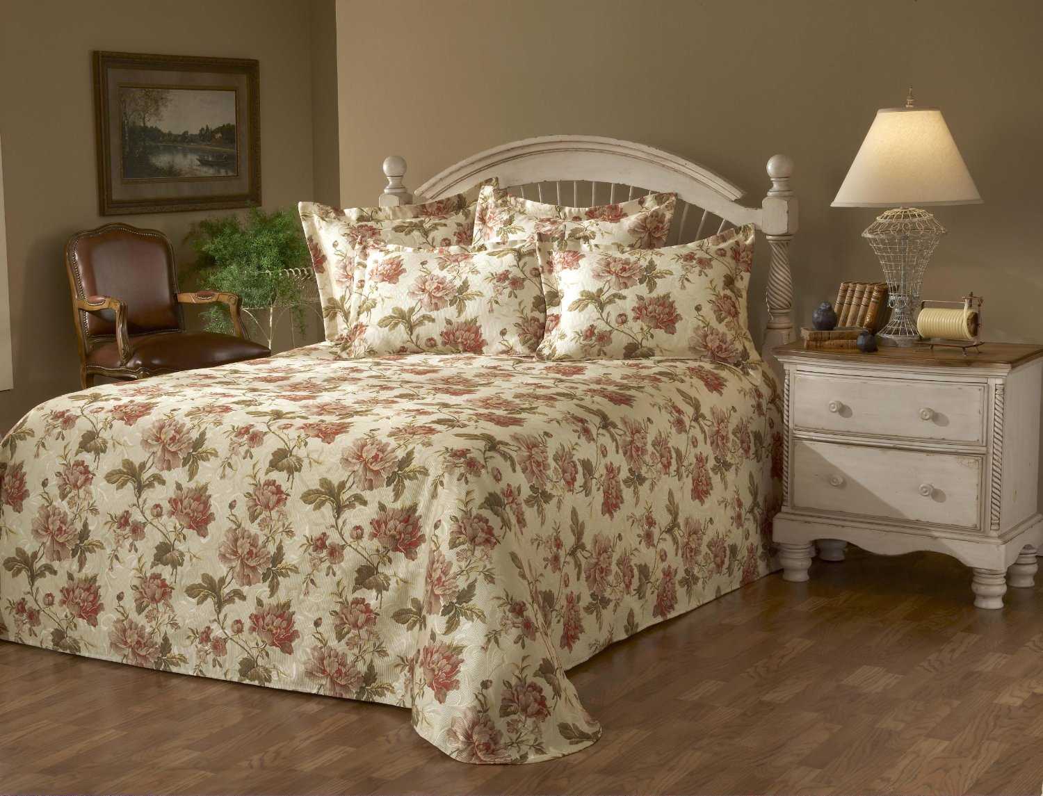 - Спальня прованс или шебби-шик декорируется светлыми тонами. Наиболее подходящим покрывалом будет полотно с цветочными узорами, выполненными в кремовых, светло-розовых тонах;