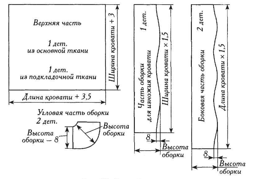 Для сложных моделей потребуется создать соответствующие выкройки. Это измеряет ширину, длину, высоту кровати. Размеры масштабируются, переносятся на лист в рамке или миллиметровую бумагу. При построении выкройки все элементы тщательно прорисовываются, учитываются расположение декоративных элементов и припуски на швы.