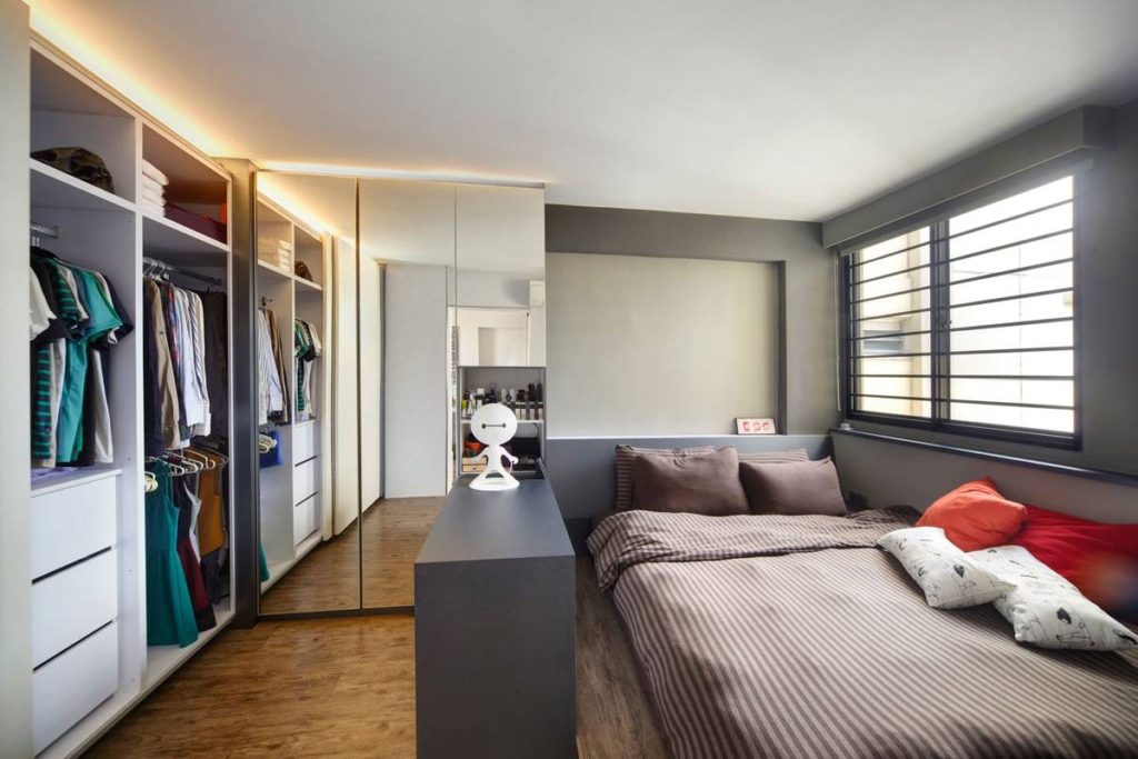 Важно! О создании подобного помещения рядышком со спальной следует думать только в том случае, если все люди, проводящие ночь в ней встают в одно и то же время. По другому один из близких будет всегда нарушать сон другого