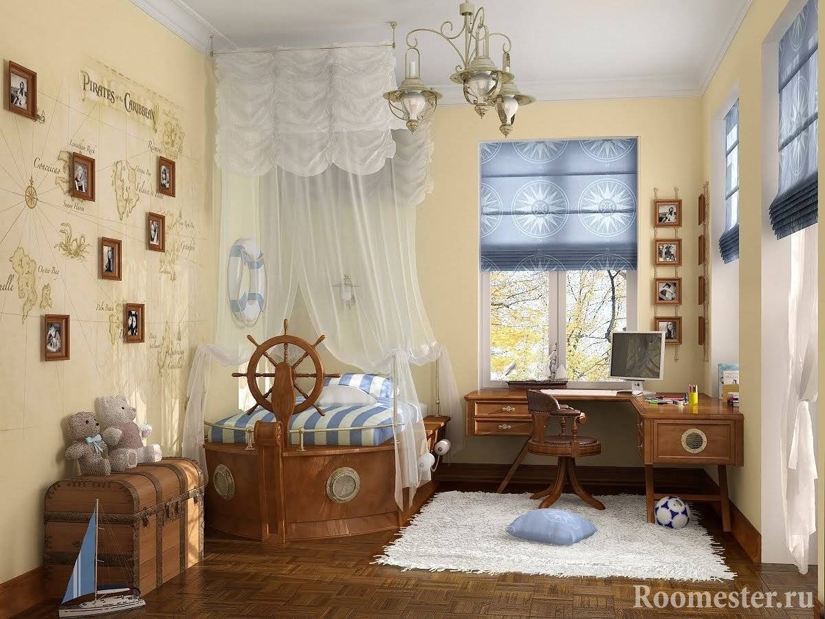 Мальчикам и девочкам понравится морское стилистическое направление в различных вариациях. Тема моря весьма обширна, в комнату можно добавить изображения и детали кораблей, штурвалы, спасательные круги, сундуки с сокровищами или картины пейзажей морского дна с подводными жителями, рыбками, русалками. Детям будет интересно играть в индейцев, особенно если в помещение поставить вигвам и разместить этнический декор. В детской можно создать настоящие джунгли или сказочный лес с животными. Юным астрономам и космонавтам понравится космическая тематика. Изображения мультипликационных, сказочных, книжных героев и милых животных также украсят помещение и создадут позитивное настроение. Комнату мальчика подростка можно оформить в стиле лофт и добавить деталей, связанных с автомобильной или спортивной тематикой. Девочке по старше подойдет помещение выполненное в романтическом стиле прованс с обилием цветочных композиций и узоров.