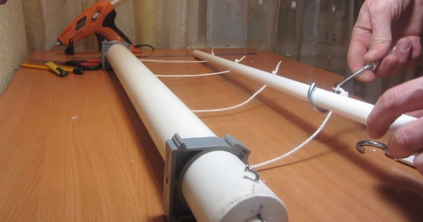 По четырем углам каркаса сушилки просверливают отверстия, через которые следует вставить недлинную веревочку и зафиксировать ее узелками. Посередине завязывают узлы с петлями, к которым прикрепляют длинную веревку и продевают ее в крючки с колесиками таким образом, чтобы они плавно опускались и поднимались.