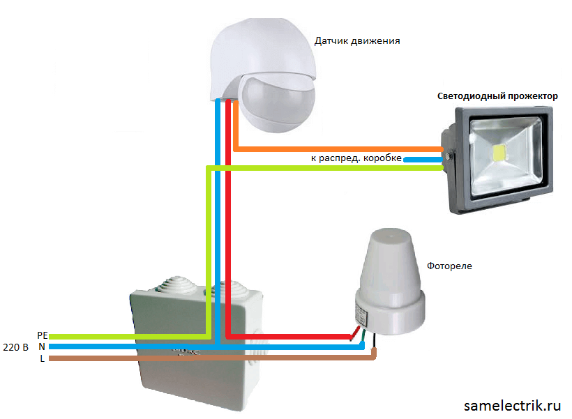 Датчик движения устанавливается в тех местах, где должны загораться светильники. Для чего он нужен? На примере уличного освещения рассмотрим простую ситуацию — освещение крыльца. Чтобы ночью попросту не расходовалась электроэнергия на работу прожектора, можно подключить к нему датчик движения, в результате чего свет будет загораться только при обнаружении движения (когда вы выйдете на крыльцо). Все остальном время прожектор будет выключен. Экономия даже после первого месяца будет ощутима. Единственный недостаток — нужно собрать такую схему, при которой датчик движения не будет включаться днем, иначе эффективность экономии будет предельно низкой, если вообще будет.