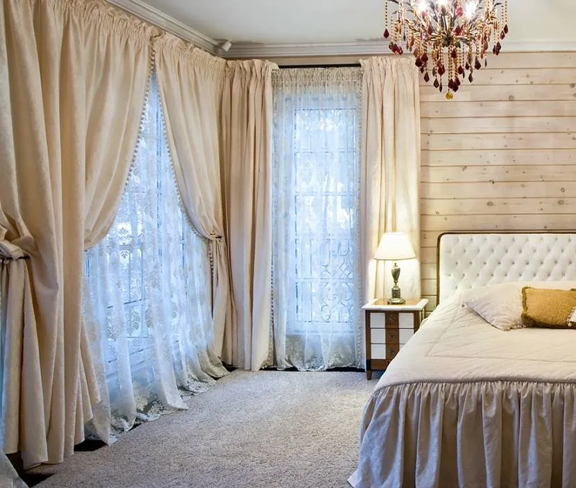 Учитывайте размер и форму оконного проема. Для узких проемов лучше приобрети карниз большей длины, тогда занавески прикроют небольшие части стены по бокам, визуально расширив оконную нишу.