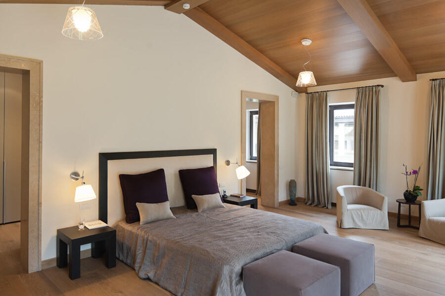 Для создания в спальне камерной атмосферы и уюта потолочное покрытие может быть выполнено из ламината. Часто применяется комбинирование материалов и разноуровневые потолки.