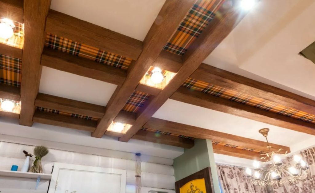 Из досок или гипсокартона собирают имитации и крепят их на каркас. Кроме того, применяют и готовые фальшбалки из полиуретана. В такие конструкции можно встроить светильники.