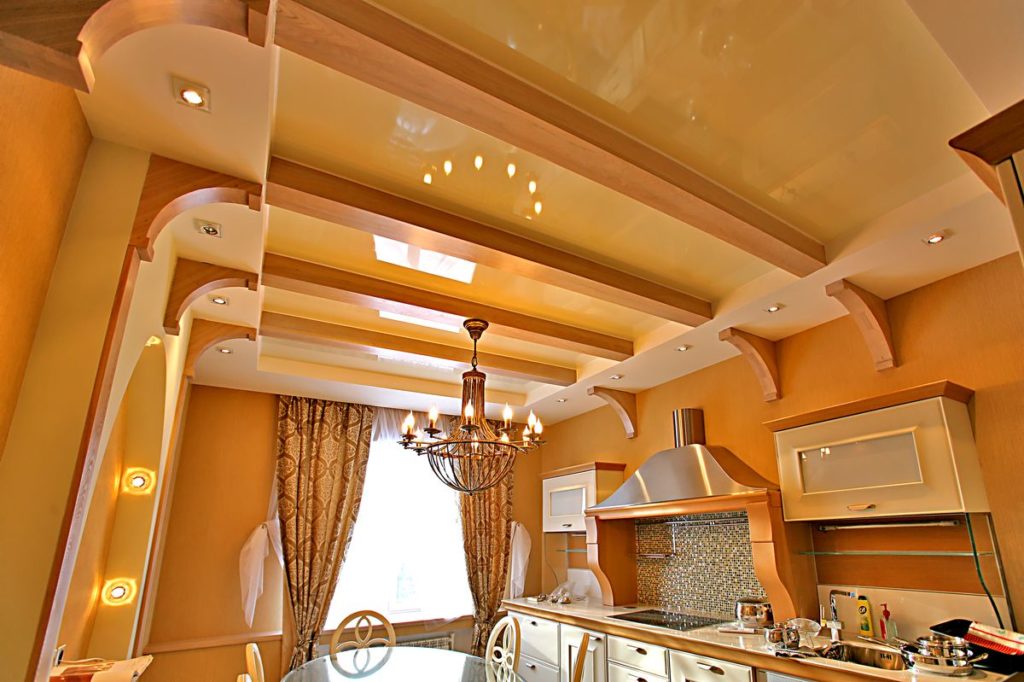 - по периметру кухни расположена гипсокартонная конструкция, в которой имеется овальное, круглое или другой формы отверстие для натяжного потолка.