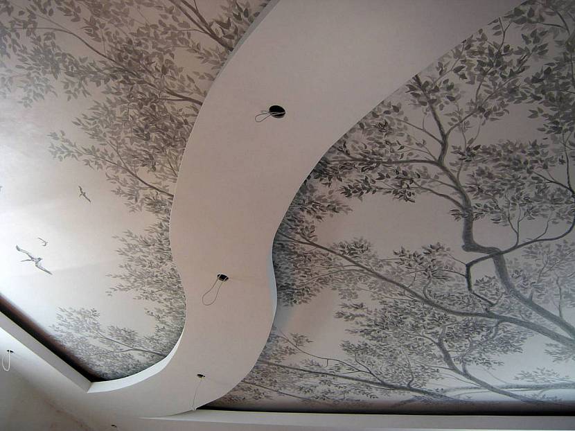 В зависимости от покрытия применяют разные техники. Например, если потолок обшит гипсокартоном или окрашен, можно использовать роспись. Для этого мягким карандашом наносят контур желаемого рисунка, а затем раскрашивают кистью. Кроме того можно пустить в ход шаблоны.