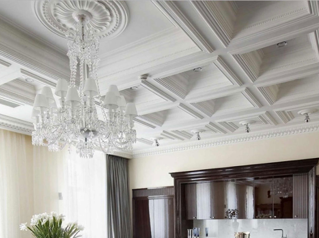 Карнизы, розетка вокруг люстры, молдинг на потолке, большое разнообразие узоров подчеркнут ваш интерьер. Но не стоит увлекаться рельефными фигурами, так как ухаживать за этой поверхностью трудно. Обычно лепные украшения делают из гипса, но из-за увесистости его часто заменяют на пенопласт или полиуретан.