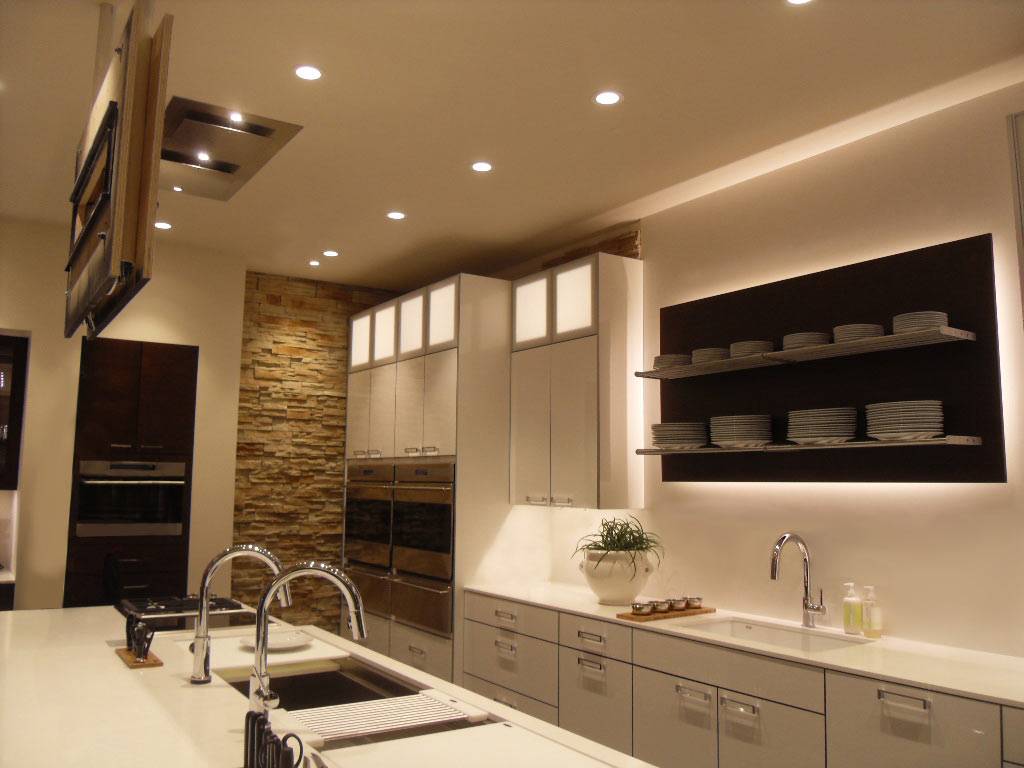 Для него используются недорогие светодиодные лампы, которые почти не нагреваются и соответственно не повлияют на состояние пленки. К тому же, вы можете сделать более яркой часть кухни либо те элементы интерьера, на которых вы хотели бы поставить акценты – стену, картины и т.п.