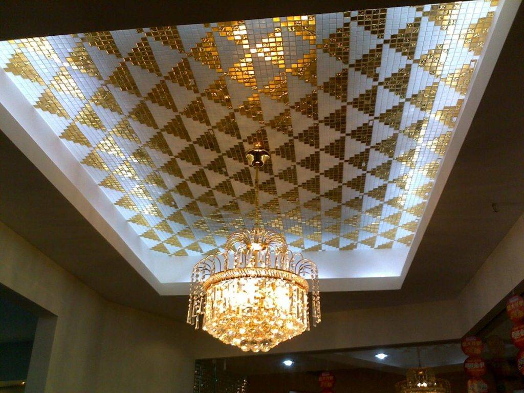 Также можно использовать имитацию мозаики при помощи натяжного потолка. Мозаику можно сформировать из элементов разного размера и фактуры. Это подойдет для квартиры с низкими потолками, так как визуально сделает их выше.