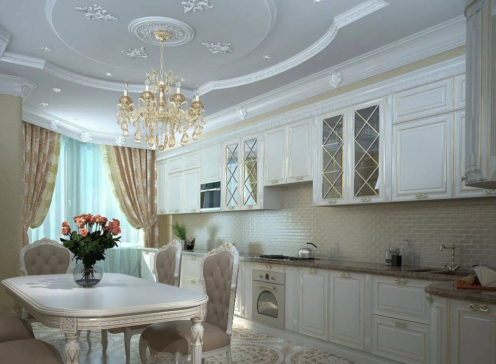 Двухуровневый потолок на кухне позволяет разделить помещение на функциональные зоны: столовую и рабочую область, подчеркнув стиль каждой из них.