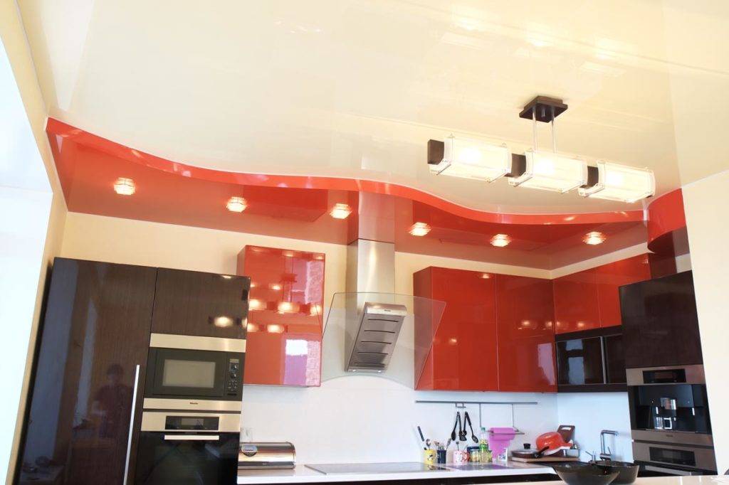Красно-белый двухуровневый глянцевый натяжной потолок, красная часть которого изогнутой формы находится над кухонным гарнитуром такой же расцветки, и все это на фоне белых матовых стен.
