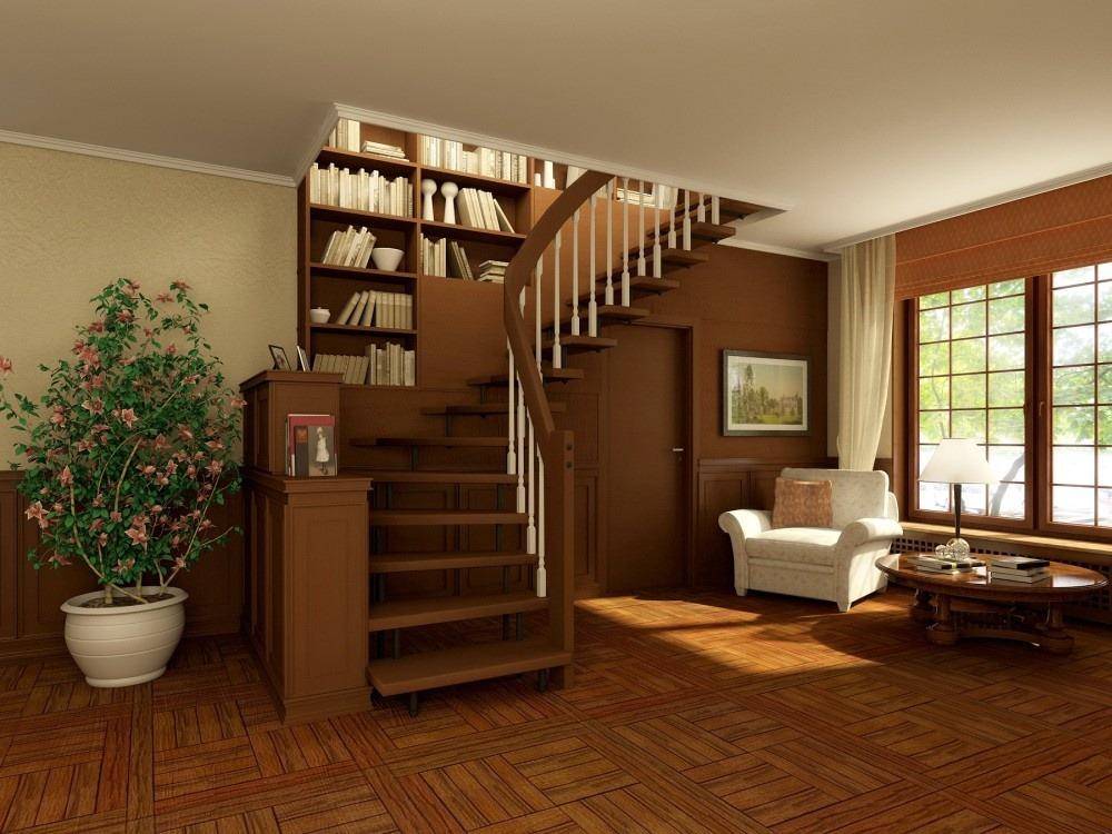 Часто встречаются деревянная междуэтажная лестница с промежуточной площадкой, а также лестница с забежными ступенями. Последний вариант лестницы располагается обычно в углах строения, что значительно экономит площадь дома. Забежная лестница из дерева сочетает изящностью винтовой конструкции и практичностью классической маршевой.
