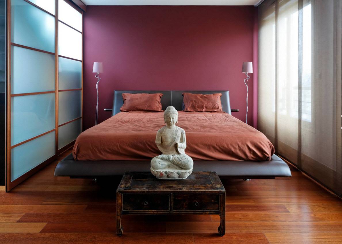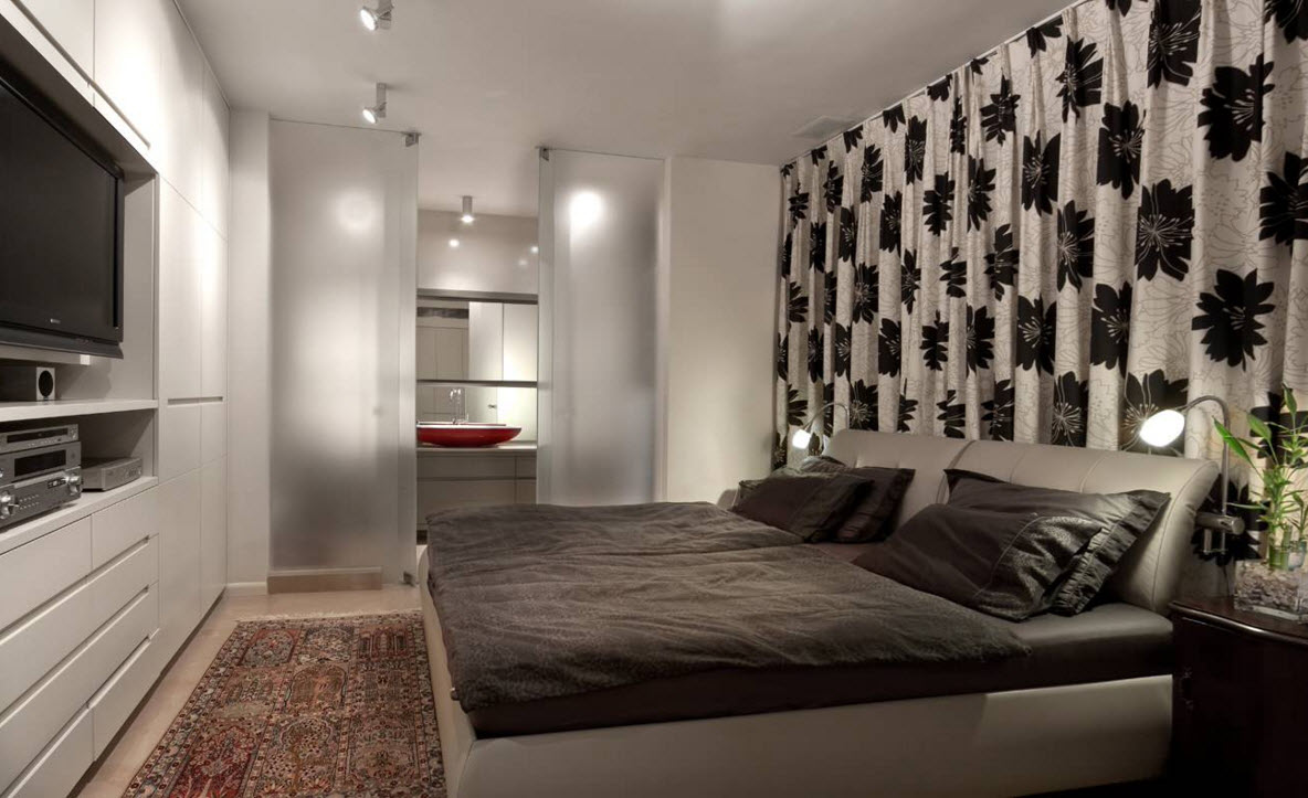 В вытянутых спальнях часто можно встретить отделение части помещения под ванную комнату. Зона водных процедур отделяется межкомнатными перегородками с раздвижными дверями (чаще всего из прозрачного или матового стекла). Главное в такой планировке спальни – чтобы кровать эргономично вставала в ширину комнаты с возможностью подхода к спальному месту со всех сторон.