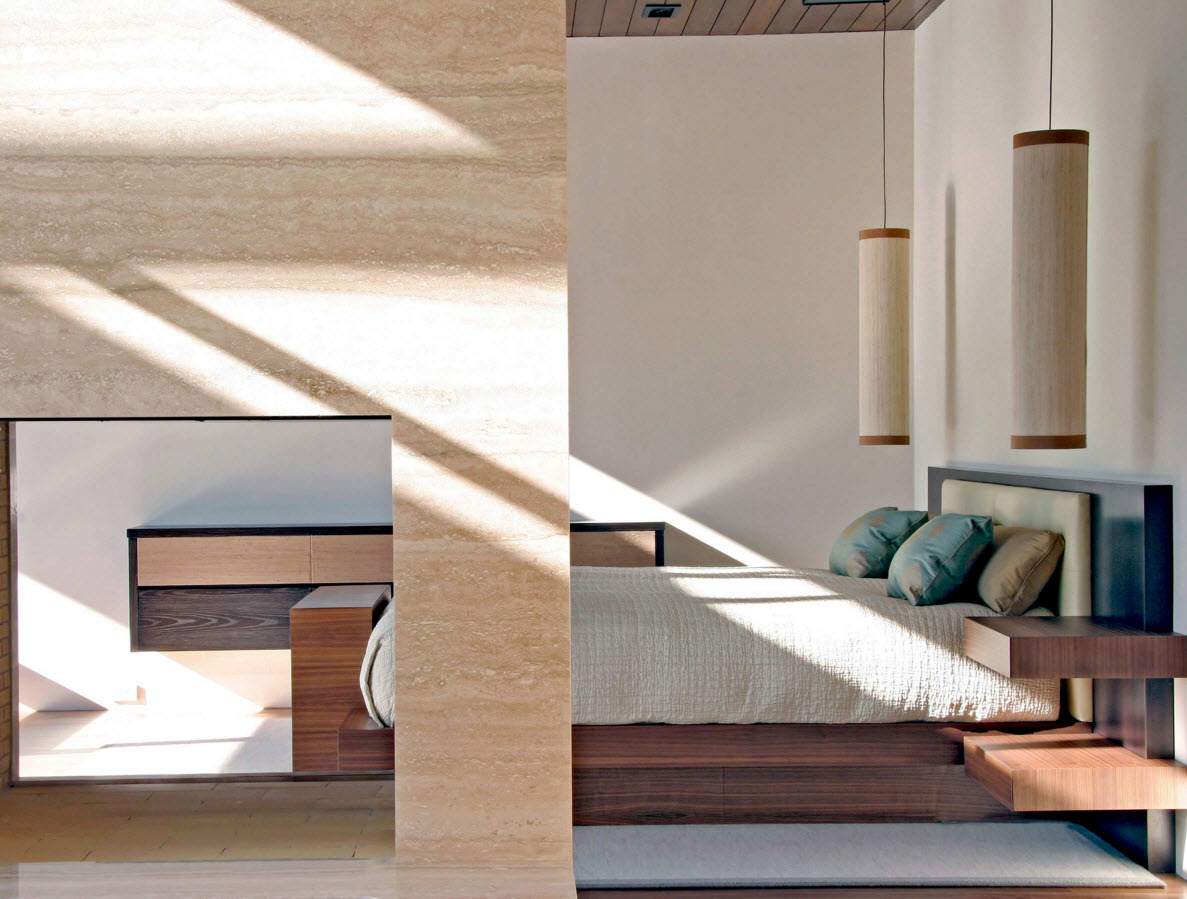 В прямоугольной спальне стену за изголовьем кровати можно использовать для создания ниш и размещения систем хранения в виде закрытых ящиков, открытых полок или комбинированных модулей. В закрытых системах хранения можно складывать постельное белье и даже предметы гардероба, на открытых полках размещаются книги и журналы.
