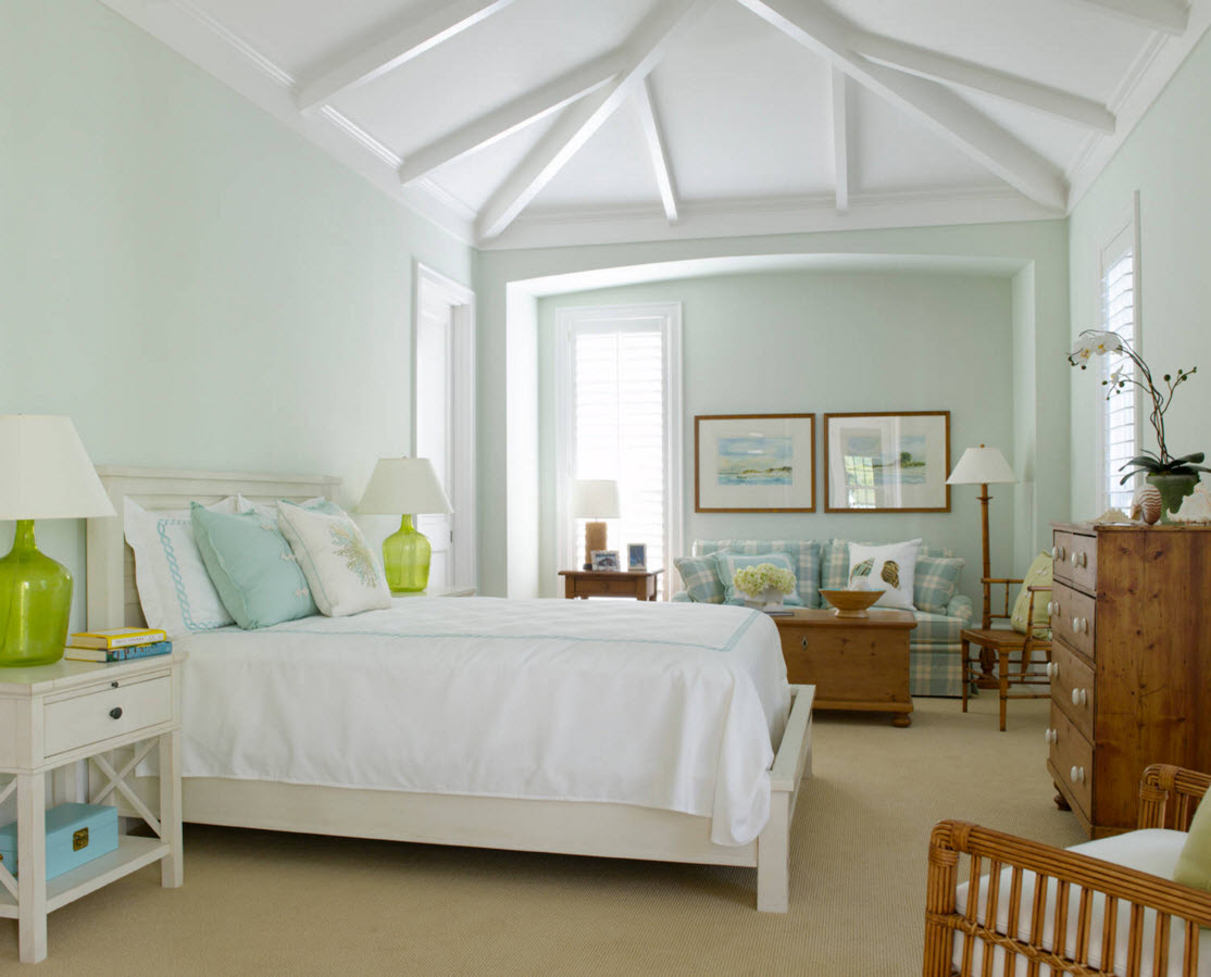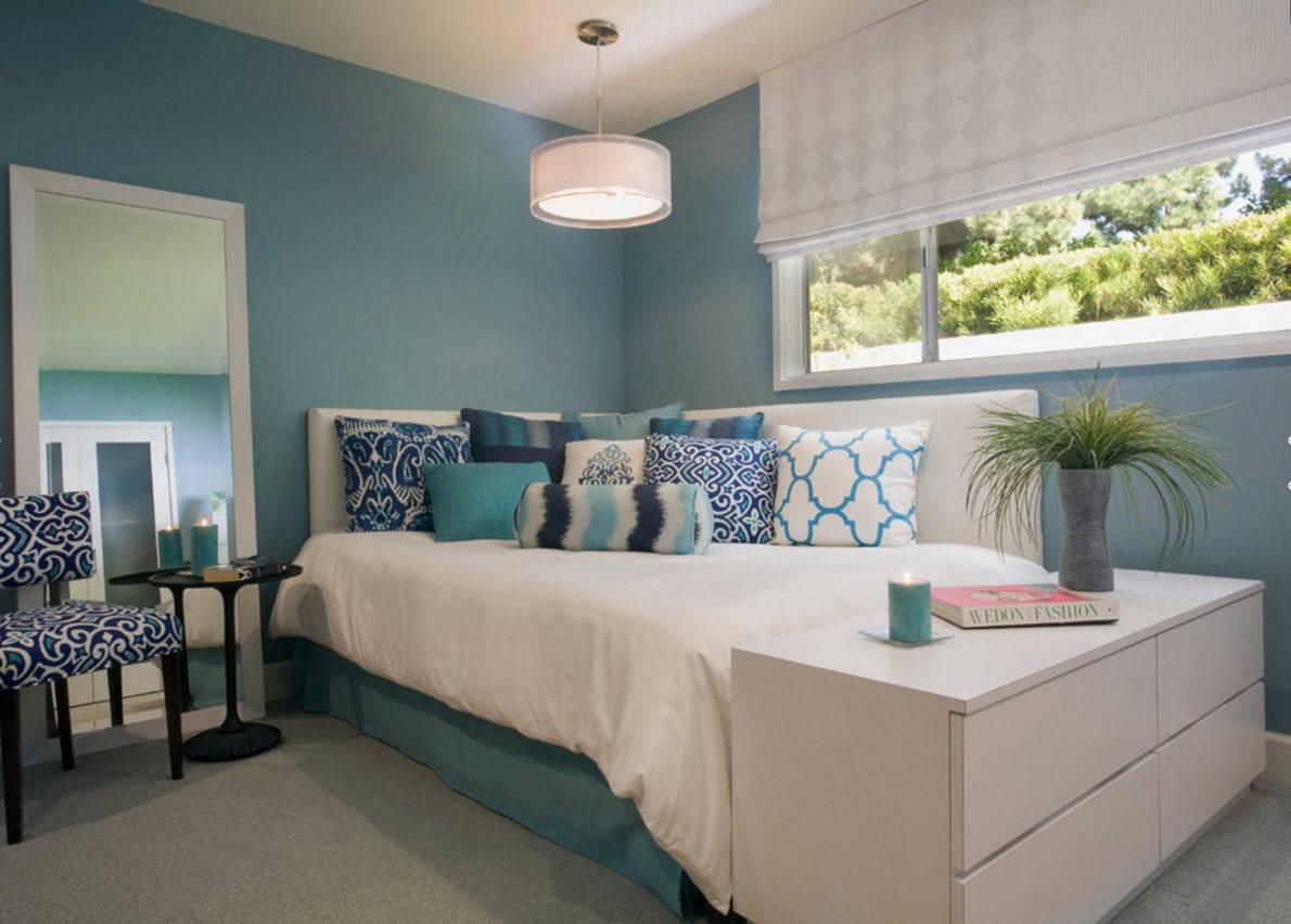 Однотонная комната нейтрального пастельного оттенка. Лучше всего остановить свой выбор на таких цветах, как зеленый, бежевый, нежные оттенки голубого, кораллового. Они создают ощущение простора, близки к природным оттенкам, настраивают на отдых и релакс.