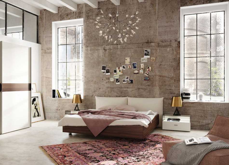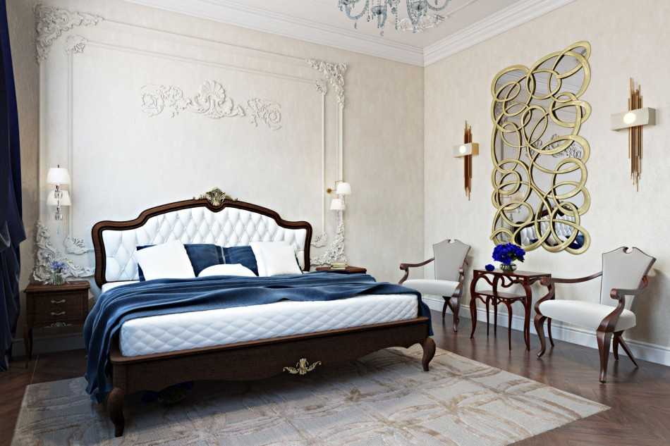 очевидно, что в такой спальне все внимание будет обращено на главный предмет мебели – кровать. И она должна быть эффектной, добротной и по возможности оригинально оформленной