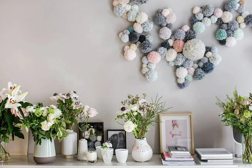 Декор стены в гостиной над камином помпонамиИсточник pinterest.co.uk