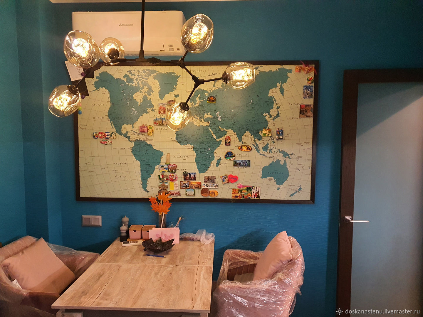 Новым и полюбившимся элементом домашнего интерьера все больше становятся магнитные доски. Почему? Да потому что с ними можно взаимодействовать. Писать друг другу послания, делать напоминалки, объяснять ребенку что-то по учёбе, рисуя ему маркерами про полтора землекопа, либо (самый скучный вариант), можно просто крепить на неё магниты из поездок, раз уж поверхности холодильника оказалось недостаточно. Магнитная доска необязательно должна напоминать чистый белый лист. Магнитной может быть, например, карта мира – странствовать по ней магнитными фишками наверняка понравится путешественникам.