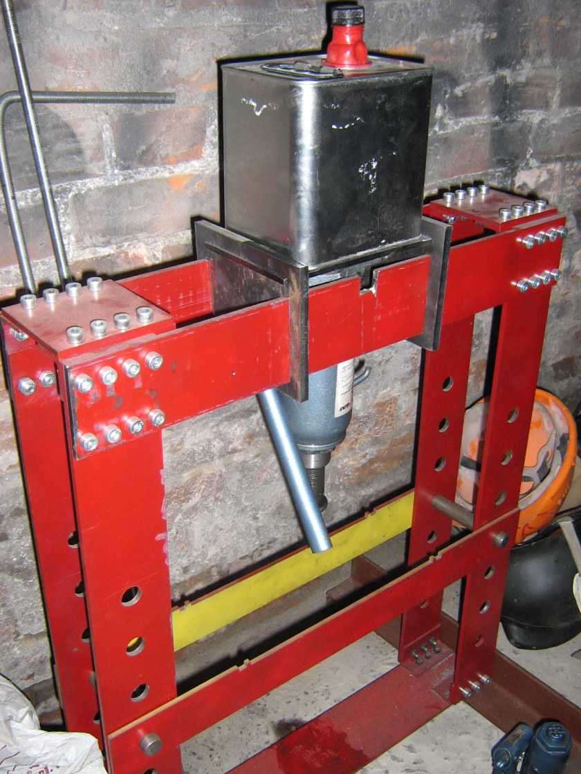 - Домкрат закрепляется в высшей части конструкции пресса и давит, соответственно, вниз.