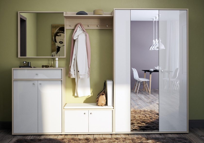 Шкаф желательно выбирать с зеркальным фасадом. Если такой возможности нет, то зеркало обязательно установить на свободной стене. Оно необходимо, чтобы перед выходом, домочадцы имели возможность привести себя в порядок.