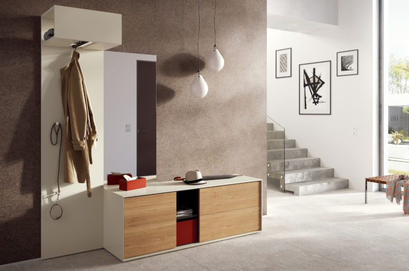 Выбор предметов и планировка полностью зависят от метража. В небольшую прихожую в современном стиле можно подобрать шкаф-купе. Это лучше, чем открытые полки или крючки, поскольку одежда визуально не будет захламлять пространство. Можно оставить пару крючков над тумбой для обуви или скамейкой. Их могут использовать гости.