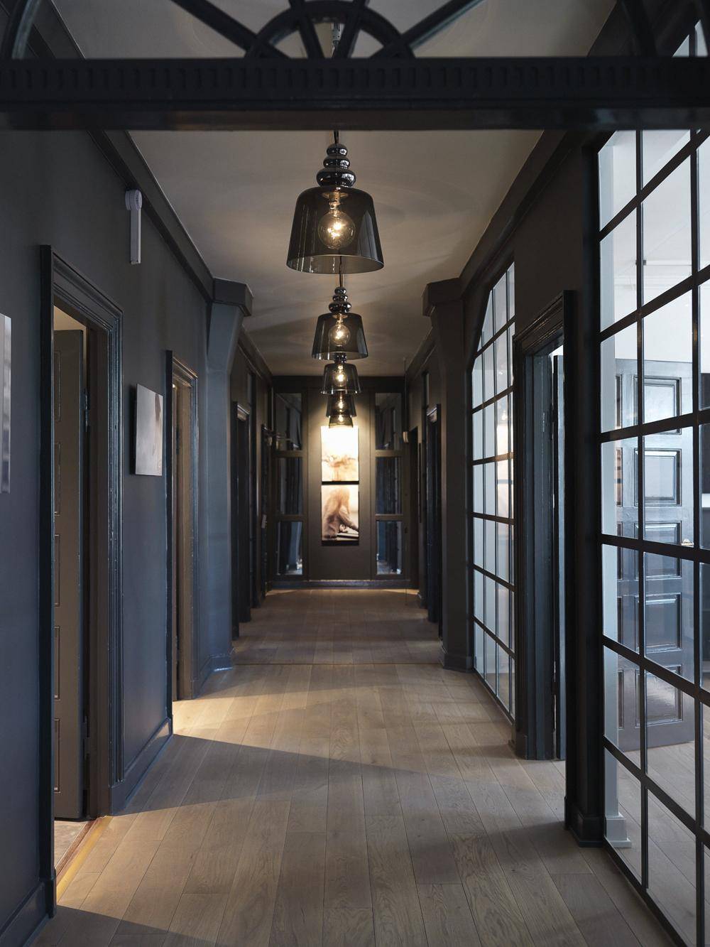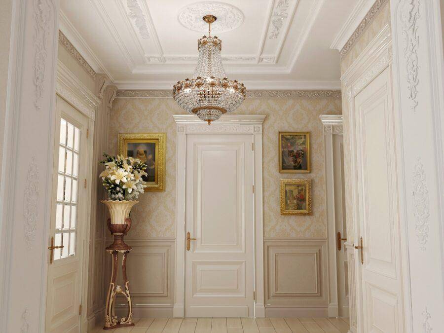Потолки должны быть идеально ровными, можно использовать как подвесные, так и натяжные. Поскольку коридор зачастую обладает довольно маленькими размерами, то установить в нём крупную люстру не получиться, выходом из ситуации может стать монтаж в потолке отдельных светильников точечного типа.